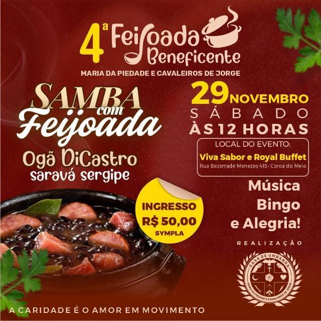 No dia 29 de novembro de 2025, a partir das 12 horas, o Viva Sabor e Royal Buffet (Rua Bezerra de Menezes, 415 – Coroa do Meio, Aracaju/SE) será palco da 4ª Feijoada Beneficente Maria da Piedade e Cavaleiros de Jorge, um evento que une boa comida, samba e solidariedade em um ambiente de fé e alegria. Com ingressos limitados para 200 pessoas, a festa promete uma tarde de celebração e confraternização em prol da caridade.