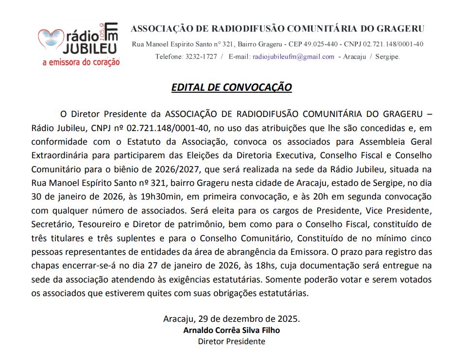 O Diretor Presidente da ASSOCIAÇÃO DE RADIODIFUSÃO COMUNITÁRIA DO GRAGERU – Rádio Jubileu, CNPJ nº 02.721.148/0001-40, no uso das atribuições que lhe são concedidas e, em conformidade com o Estatuto da Associação, convoca os associados para Assembleia Geral Extraordinária para participarem das Eleições da Diretoria Executiva, Conselho Fiscal e Conselho Comunitário para o biênio de 2026/2027, que será realizada na sede da Rádio Jubileu, situada na Rua Manoel Espírito Santo nº 321, bairro Grageru nesta cidade de Aracaju, estado de Sergipe, no dia 30 de janeiro de 2026, às 19h30min, em primeira convocação, e às 20h em segunda convocação com qualquer número de associados.