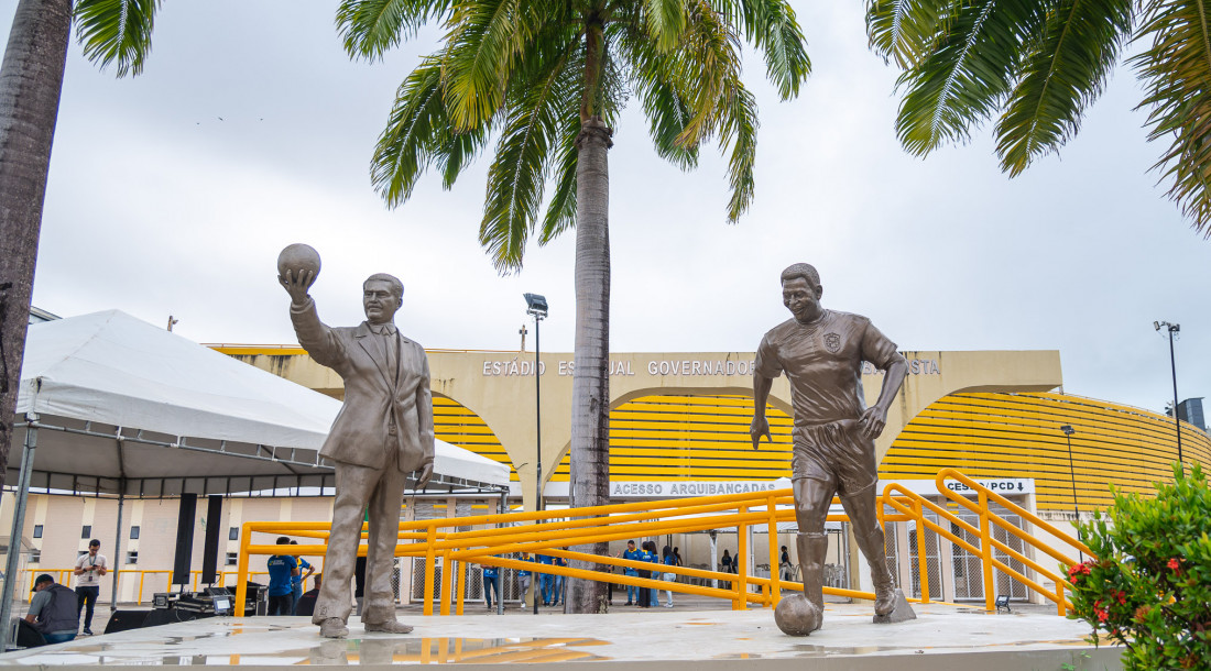 A Arena Governador Lourival Baptista, o Batistão, viveu um momento histórico com a inauguração de duas esculturas em homenagem a personagens que marcaram a trajetória do futebol em Sergipe e no Brasil: o ex-governador Lourival Baptista, idealizador do estádio, e o Rei Pelé, Edson Arantes do Nascimento, que participou da partida inaugural da praça esportiva em 9 de julho de 1969. A solenidade, promovida pelo Governo de Sergipe, por meio da Secretaria de Estado do Esporte e Lazer (Seel), reuniu, nesta quarta-feira, 11, familiares de Lourival Baptista, cronistas e radialistas esportivos, dirigentes de clubes sergipanos e representantes das entidades que organizam o futebol no estado. O evento reforçou o papel do Batistão como símbolo da identidade esportiva sergipana e patrimônio afetivo de gerações.